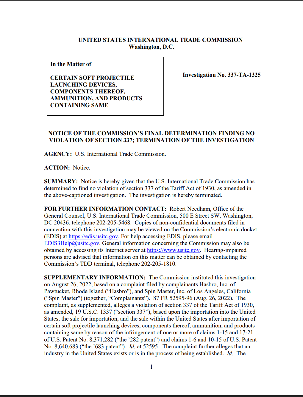 As previously detailed, Hasbro and Spin Master (who owns the patents in question) filed for a Section 337 Investigation for unfair trade and import practices against a domestic industry. Namely, against Hasbro’s plans to release the Nerf Pro Gelfire line. After an initial look, the United States International Trade Commission decided there was enough evidence to warrant investigation, and things went from there. Both as to whether an IP violation occurred, and whether there was a domestic industry being harmed by it (both parts are necessary for the process).