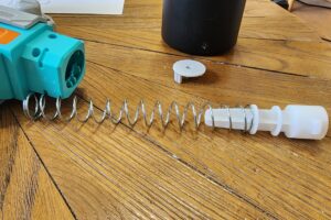 As for mod potential, there are already some interesting things to highlight. My Delta Pro had two 19mmx14mmx1.6mm spacers on the spring rest; removing those only decreased velocity by ~4fps, but one could in theory print their own spacers for a small boost. The spring is ~145mm long, with 18.2mmOD, 1.5mm wire OD, and one coil per ~10mm, with a bit of wiggle room in terms of spring replacement diameter.