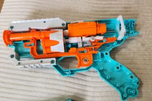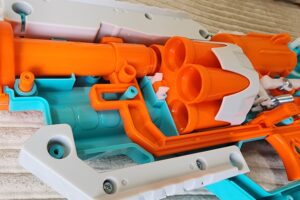 The Delta Pro is roughly the same size as other blasters in its class; if you’ve used a Dart Zone Max Outlaw or Adventure Force Deuce Pro, then you’re familiar with its size. The blaster is basic in operation (prime the top slide, return it, and fire), making it easy to use. The cylinder, however, is integral to the blaster, so you will not be able to remove it. It can be turned by hand, though, and there are loading slots on either side of the blaster. That’s not necessarily bad – it’s a $14 blaster, after all. That’s just the progression of features you get as you spend more money on a blaster (this is a step above things like the Adventure Force Cricket Pro, after all).