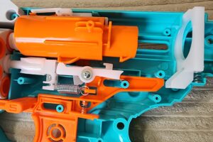 The Delta Pro is an interesting mix of traditional revolver and Outlaw-style barrel operation. The barrel retracts on the trigger pull, sealing against the cylinder while pressing it back against the plunger tube gasket. Despite the retracting barrel, the front of the blaster has been widened to allow the use of accuracy attachments. At the same time, if the barrel and trigger are linked…manipulating/hitting the barrel could fire the blaster. To prevent that, there’s an extra safety feature! The trigger pivots slightly against a spring (and out of the way of an internal ridge) when you press it, but it doesn’t pivot if the force comes from pressing in the barrel. I know I wouldn’t have thought about that possibility, so kudos to Dart Zone for solving a potential issue ahead of time.