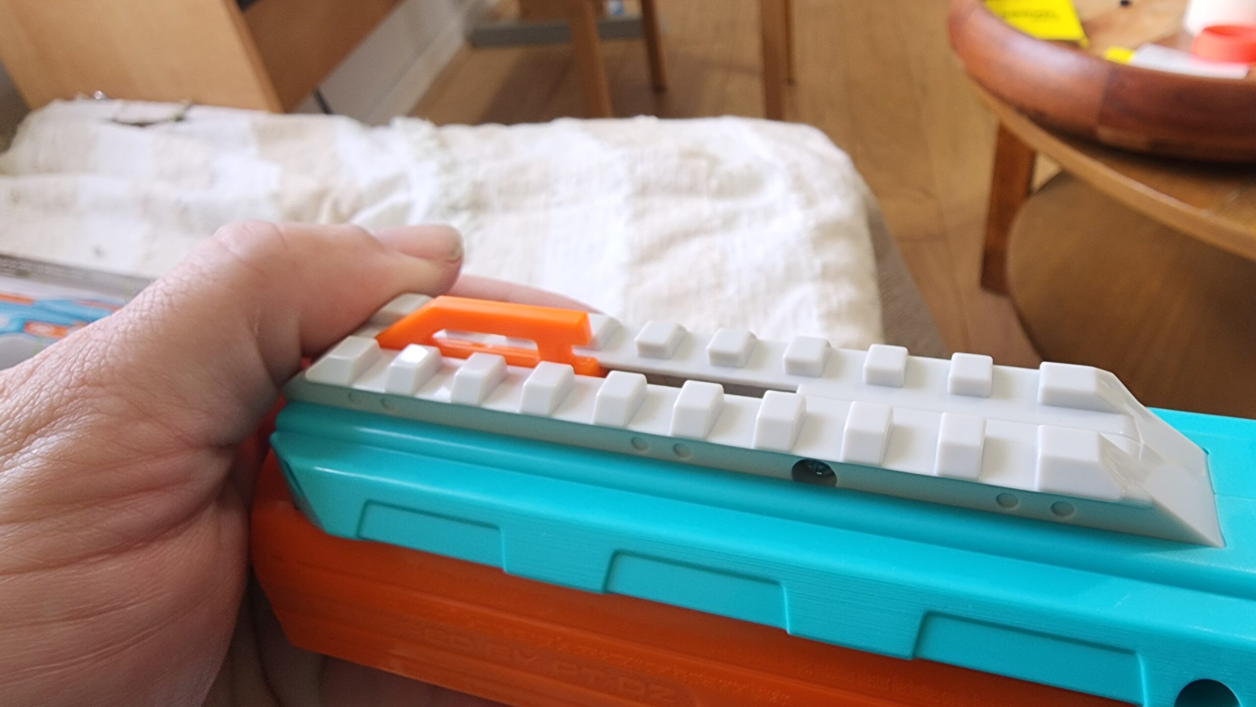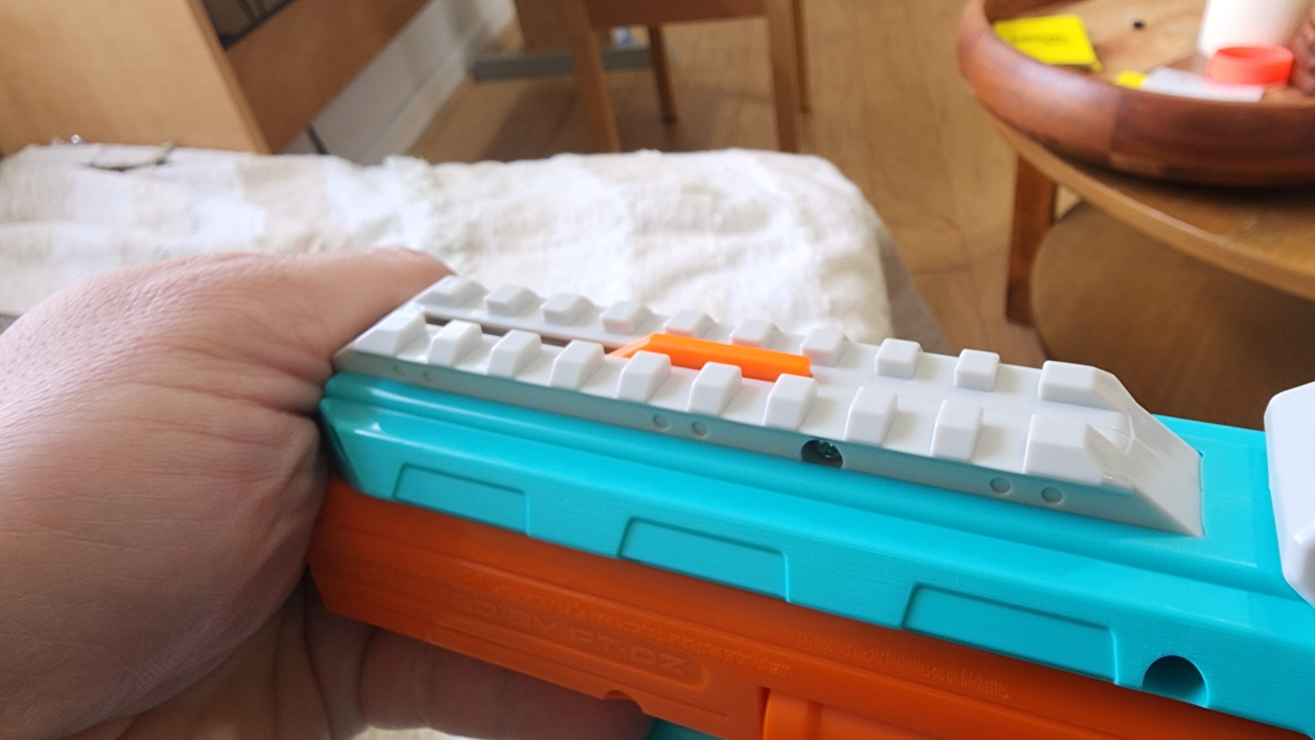 The Delta Pro is an interesting mix of traditional revolver and Outlaw-style barrel operation. The barrel retracts on the trigger pull, sealing against the cylinder while pressing it back against the plunger tube gasket. Despite the retracting barrel, the front of the blaster has been widened to allow the use of accuracy attachments. At the same time, if the barrel and trigger are linked…manipulating/hitting the barrel could fire the blaster. To prevent that, there’s an extra safety feature! The trigger pivots slightly against a spring (and out of the way of an internal ridge) when you press it, but it doesn’t pivot if the force comes from pressing in the barrel. I know I wouldn’t have thought about that possibility, so kudos to Dart Zone for solving a potential issue ahead of time.